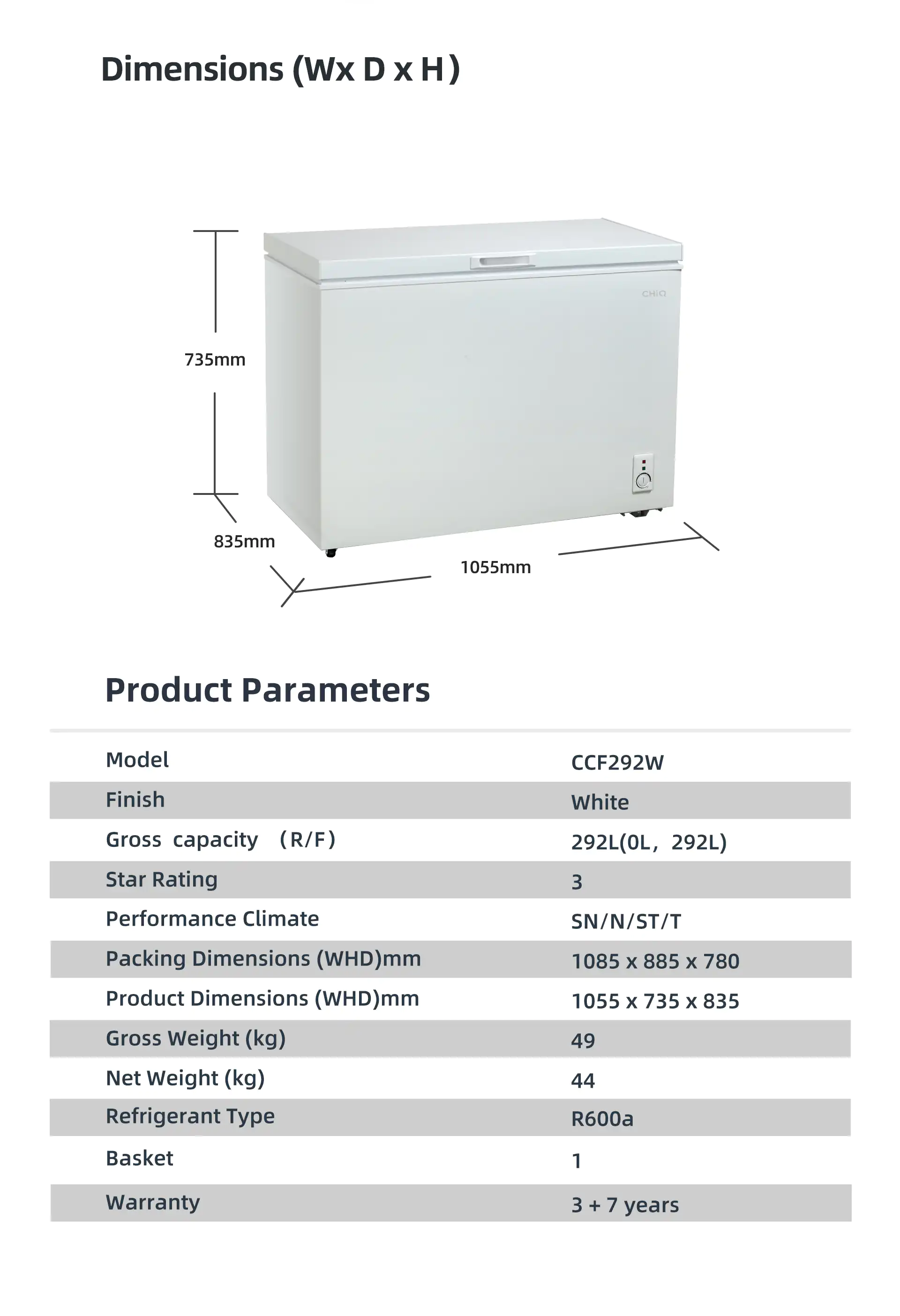 CHiQ 292L White Chest Freezer